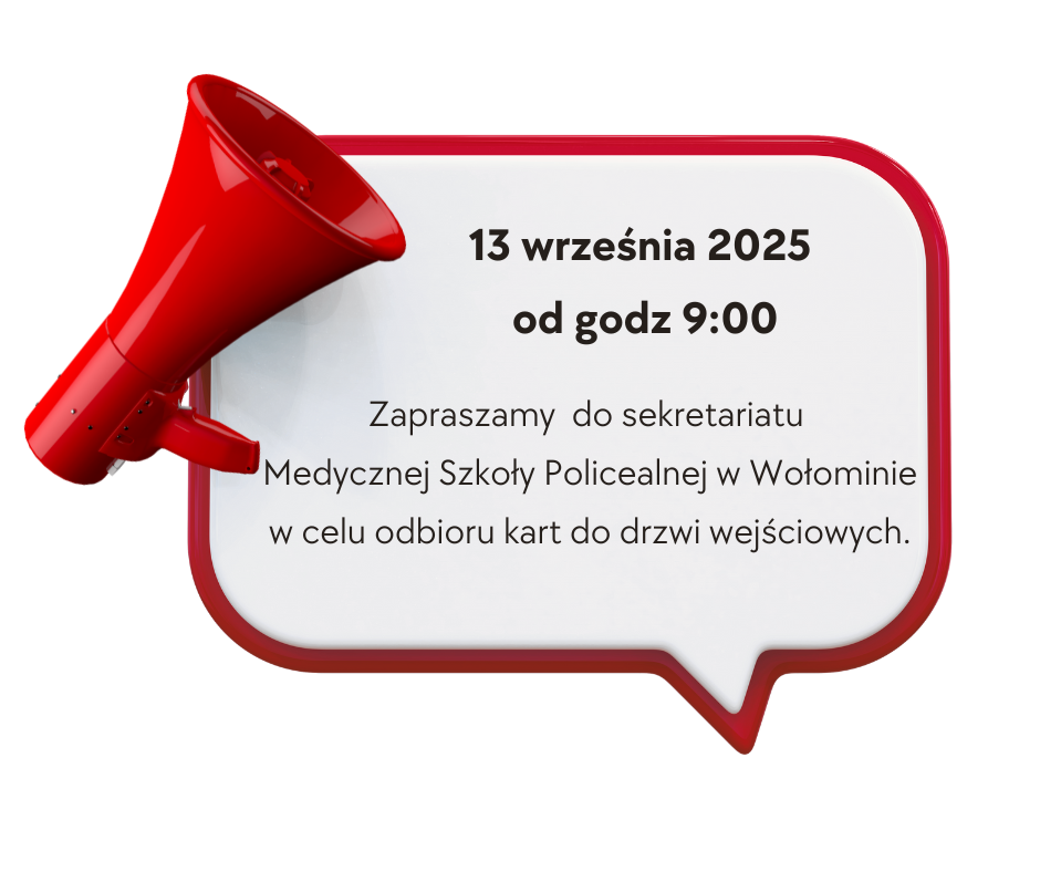 Zapraszamy w dniu 13 września 2025 roku od godziny 9.00 do sekretariatu Medycznej Szkoły Policealnej w Wołominie w celu odbioru kart do drzwi wejściowych.